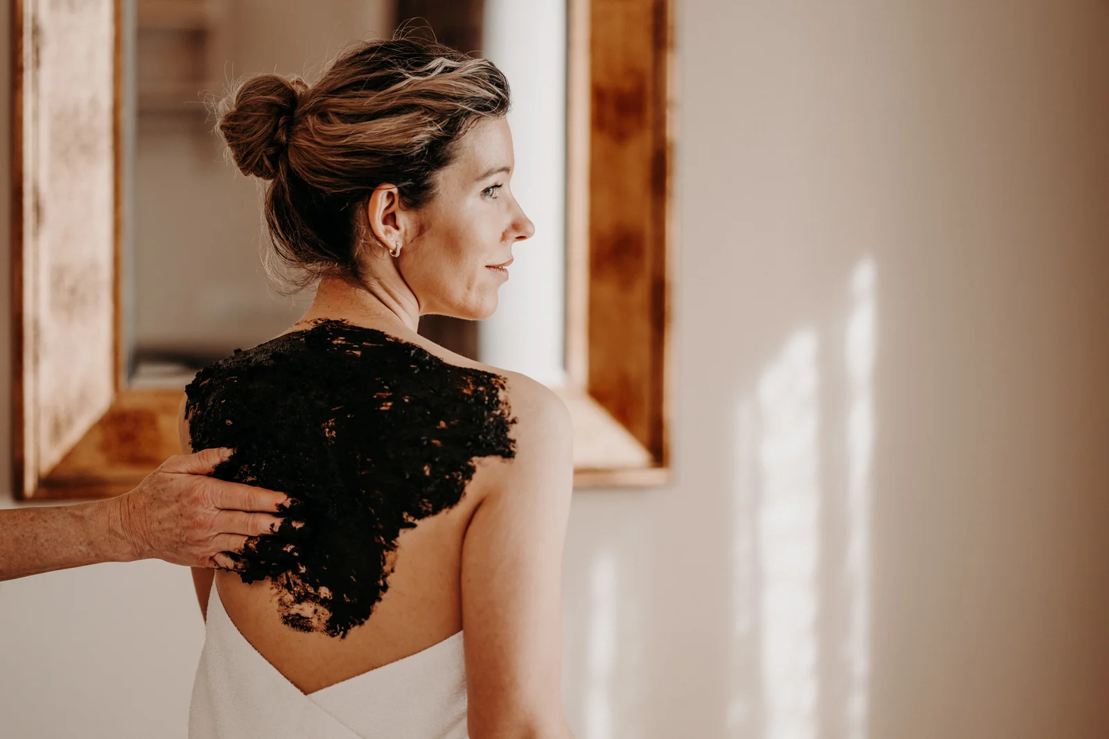 Person mit hochgestecktem Haar bekommt eine schwarze Paste auf den Rücken aufgetragen.