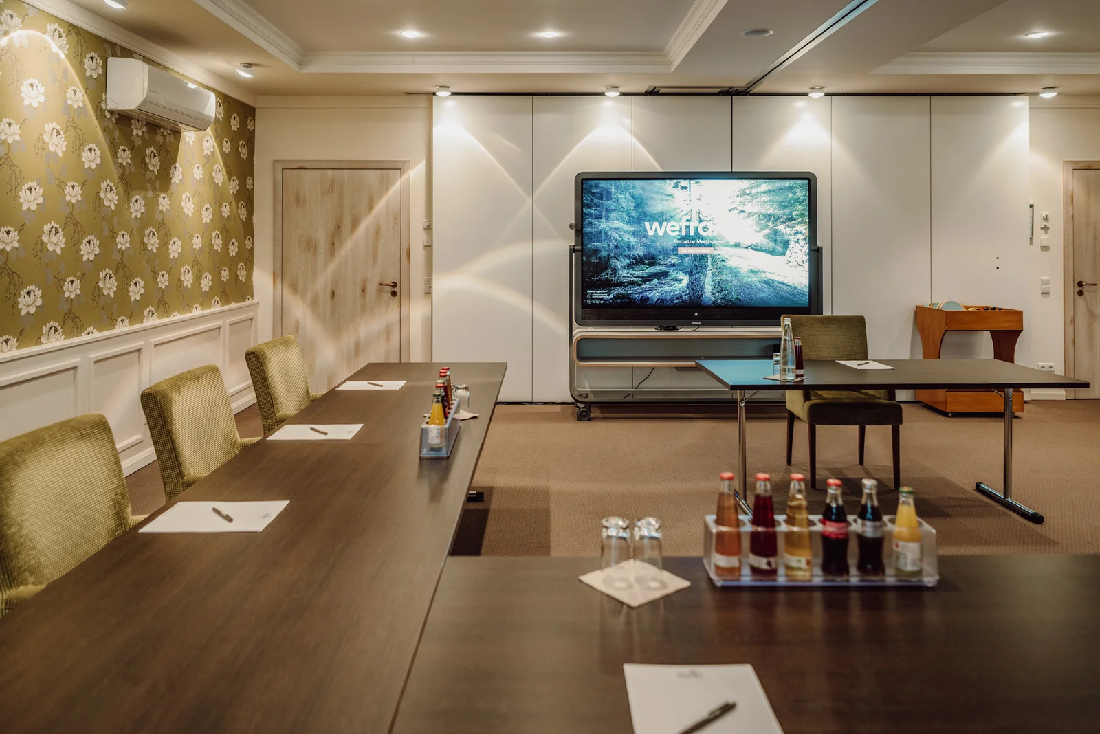 Konferenzraum mit U-förmigem Tisch, grünen Stühlen, einem großen Bildschirm und Getränken auf dem Tisch.Seitenansicht der Tische und Stühle im Tagungsraum des Hotel Eisvogel.Seitenansicht des Tagungsraums mit Stühlen und Tischen des Hotel Eisvogel.Konferenzraum mit Tischen, Stühlen, Getränken und einem großen Bildschirm an der Wand.Konferenztisch mit Stühlen, Schreibunterlagen und Stiften. Auf dem Tisch stehen Getränke und Gläser.Konferenzraum mit Tischen in U-Form, grünen Stühlen, Flipchart und Getränken auf den Tischen.Konferenzraum mit einem großen Bildschirm, einem Tisch mit Getränken und Stühlen, florale Tapete an der Wand.Drei Stühle mit einem Tisch und Getränke im Hotel EisvogelKonferenzraum mit grünen Stühlen, Tischen, Getränken und einem großen Bildschirm an der Wand.Außenansicht eines beleuchteten Gebäudekomplexes mit Terrasse und Garten bei Dämmerung.