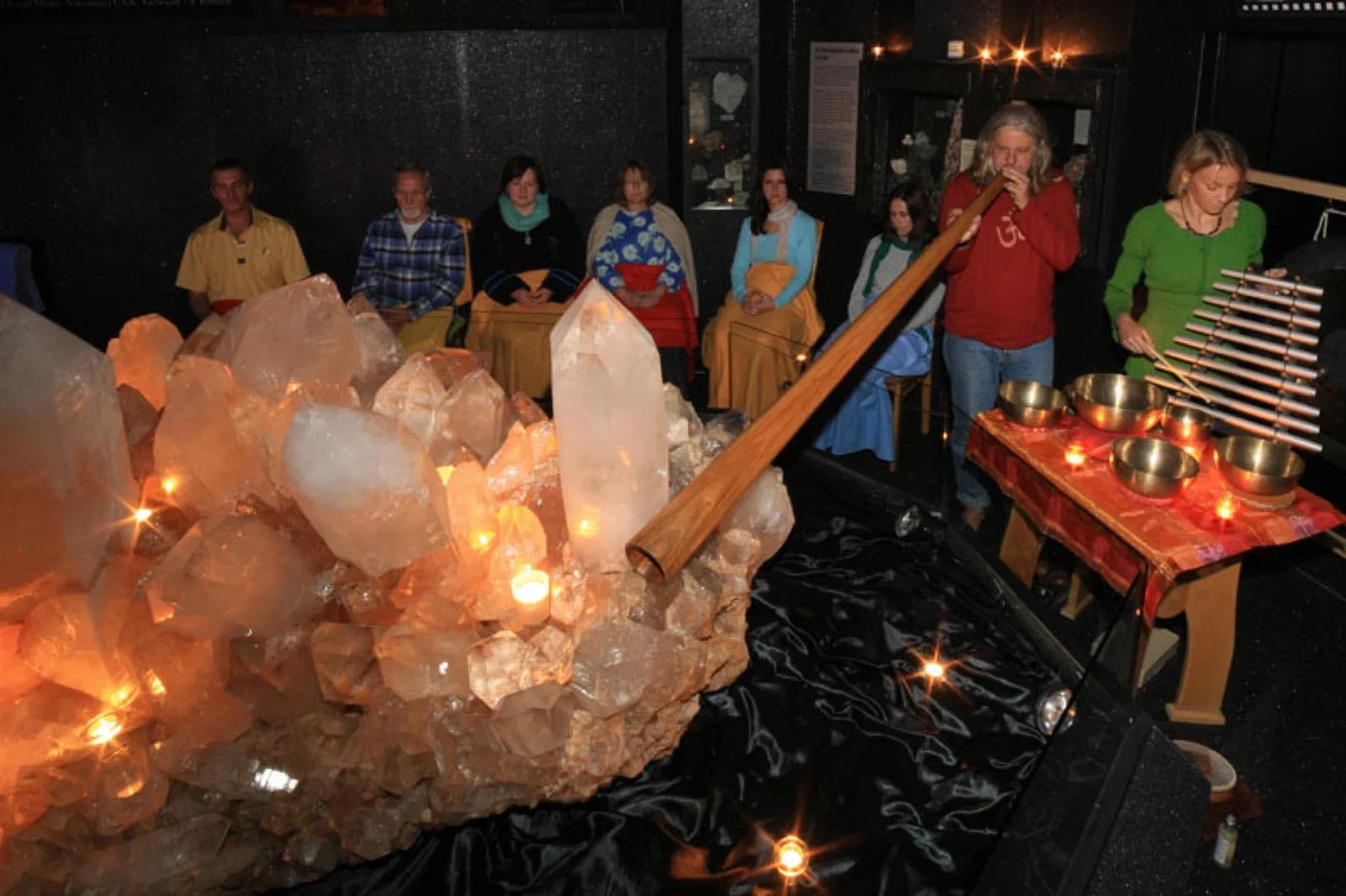 Kristallmuseum mit Besuchern und zwei Musikern mit Klangistrumenten