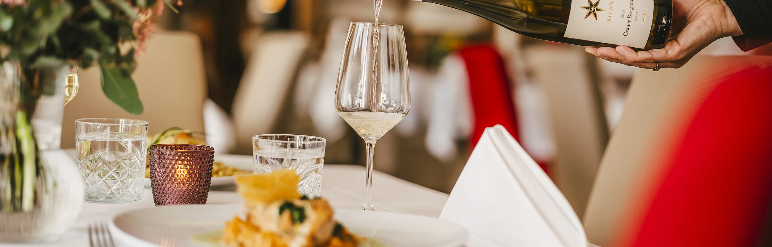 Anne-Sophie Stern präsentiert die vielfach ausgezeichneten Weine unseres befreundeten Weinguts Stern aus Hochstadt. Ursprünglich über eine Freundschaft der beiden Großväter zusammengekommen, verbindet uns auch heute noch die Tradition und Leidenschaft für das was wir tun. Dazu serviert Ihnen unser Küchenteam ein 5-Gang-Menü mit ausgewählten heimischen Produkten – auf Wunsch auch vegetarisch. Preis p. P. 89,00 Euro Sonderpreis inkl. Übernachtung ab 139,00 Euro p.P. im Doppelzimmer 30,- € EZ-Zuschlag Wir freuen uns auf Ihre Reservierung!