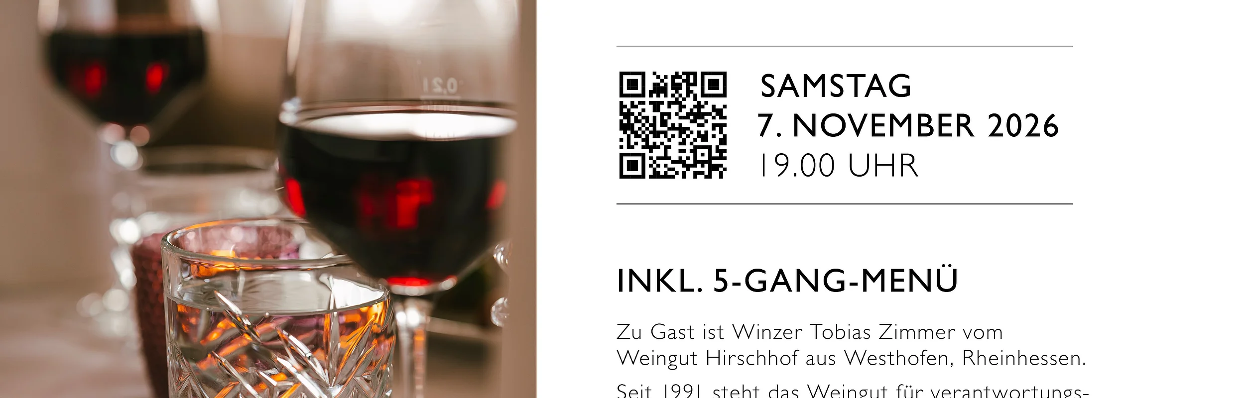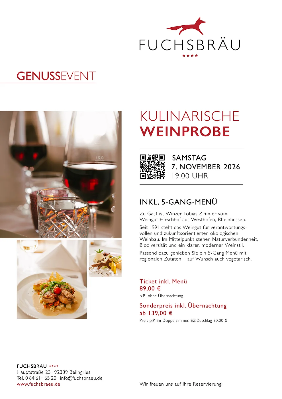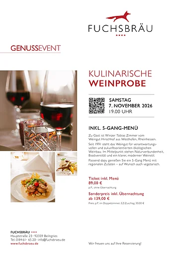 KULINARISCHE WEIN PROBE IM FUCHSBRÄU Zu Gast ist Winzer Tobias Zimmer vom Bio Weingut Hirschhof aus Westhofen. Seit 1991 steht das Weingut für verantwortungsvollen und zukunftsorientierten ökologischen Weinbau. Im Mittelpunkt stehen Naturverbundenheit, Biodiversität und ein klarer, moderner Weinstil. Dazu serviert Ihnen unser Küchenteam ein 5-Gang-Menü mit ausgewählten heimischen Produkten – auf Wunsch auch vegetarisch. Preis p. P. 89,00 Euro Sonderpreis inkl. Übernachtung ab 139,00 Euro p.P. im Doppelzimmer 30,- € EZ-Zuschlag
